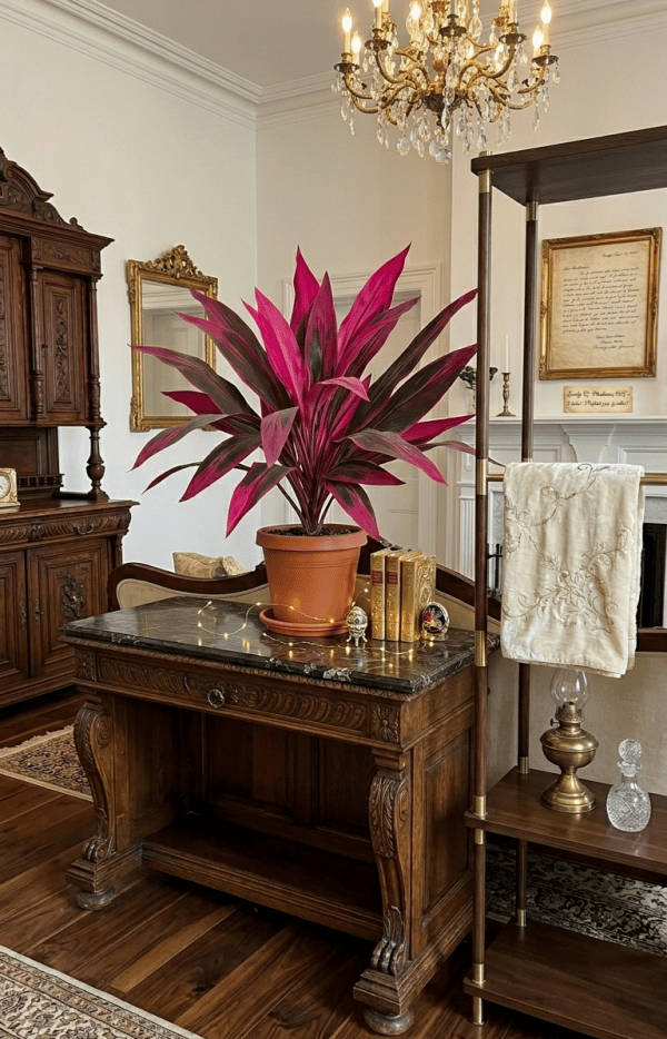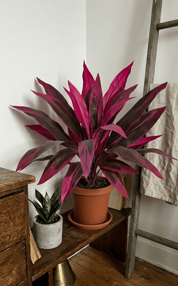 Neutral spaces can sometimes feel flat or unfinished. With its rich magenta and deep purple tropical leaves, this plant adds an eye-catching pop of color that makes your room feel more lively, styled, and full of energy.